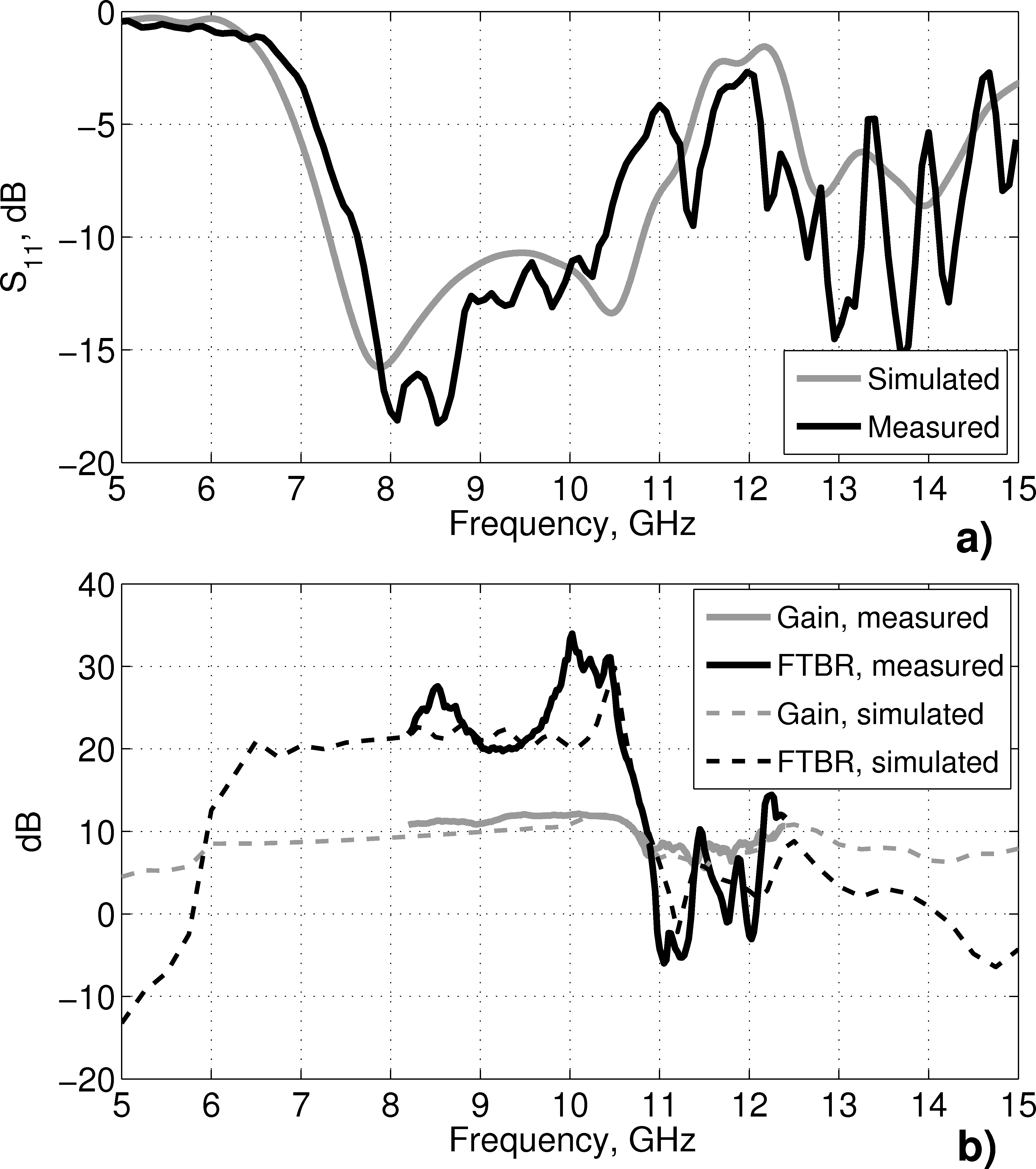 Triangular EBG Antenna: a) S11; b) gain and Front-To-Back-Ratio (FTBR) [1]. |