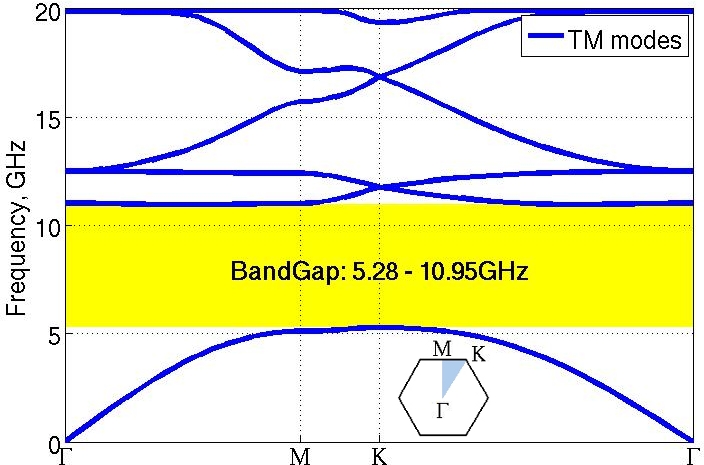 If we excite a TM mode in a cavity created by removing a dielectric rod from the lattice, energy at frequencies outside the band-gap will be free to propagate through the structure, while energy at frequencies within the bandgap will be trapped in the cavity. Trapped energy can be directed toward a specific direction by creating an angular defect in the structure.